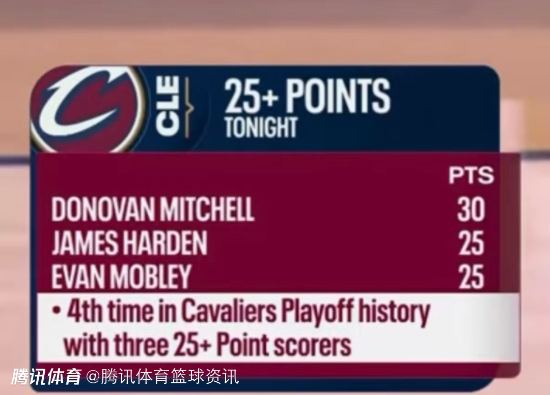 另据数据统计显示,米切尔、哈登、莫布利本场险些打出三人同砍30+的表现,这是骑士队史第四次在季后赛中单场有三人得分25+。